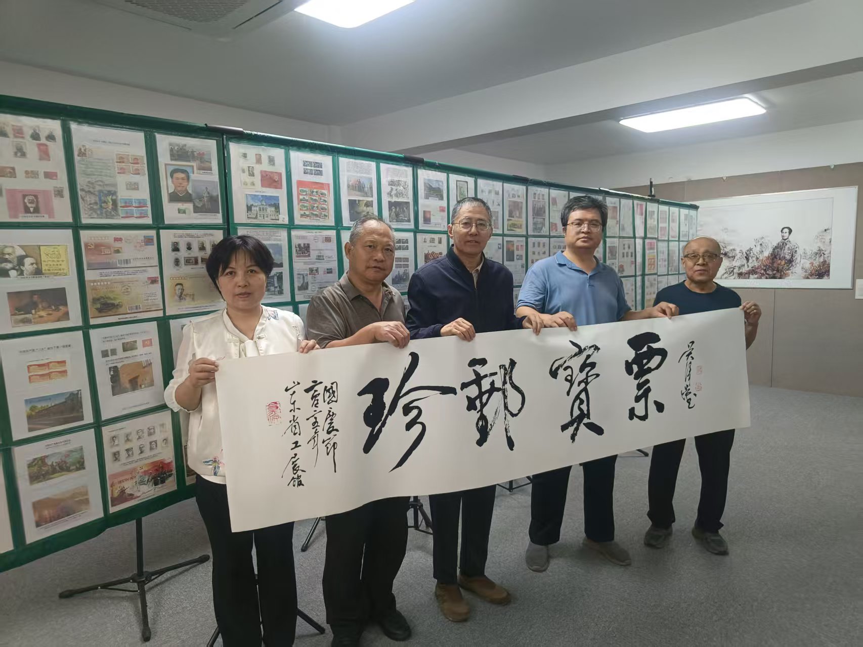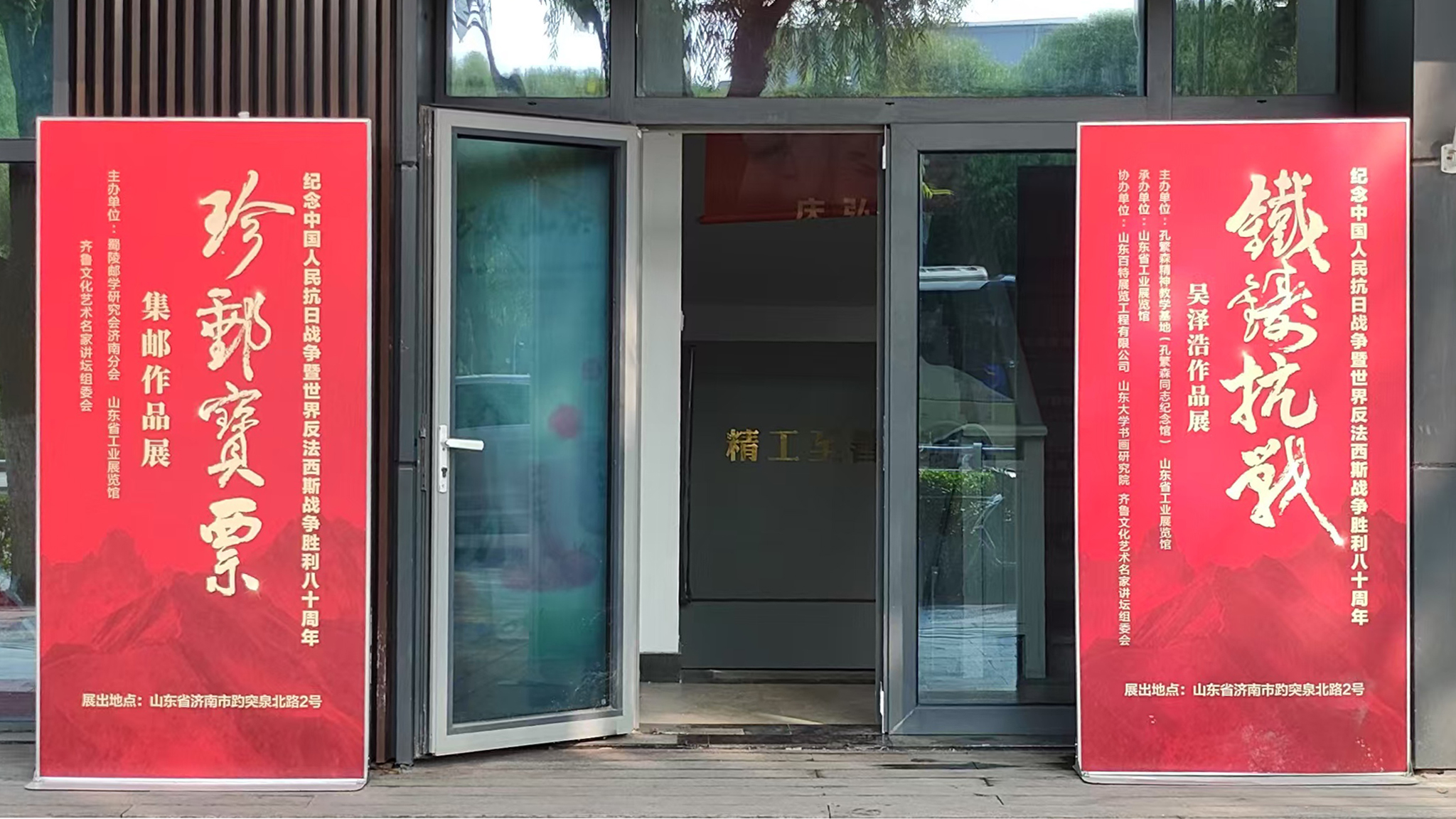 纪念抗日战争暨世界反法西斯战争胜利80周年红色集邮展览与“铁铸抗战”吴泽浩作品特展在山东省工业展览馆红色文化展厅联袂展出。