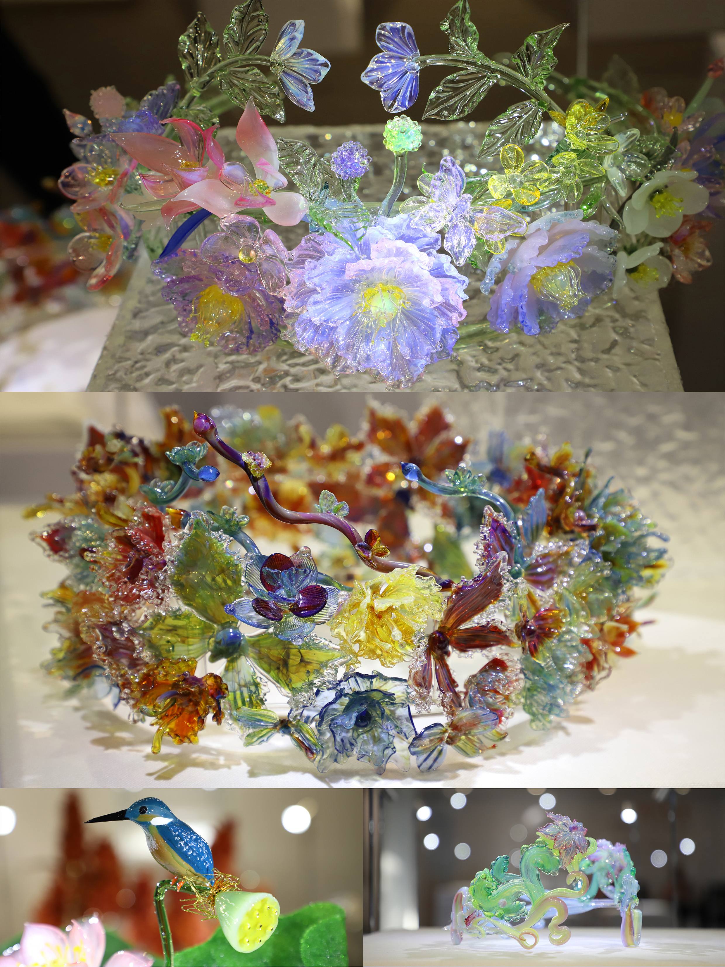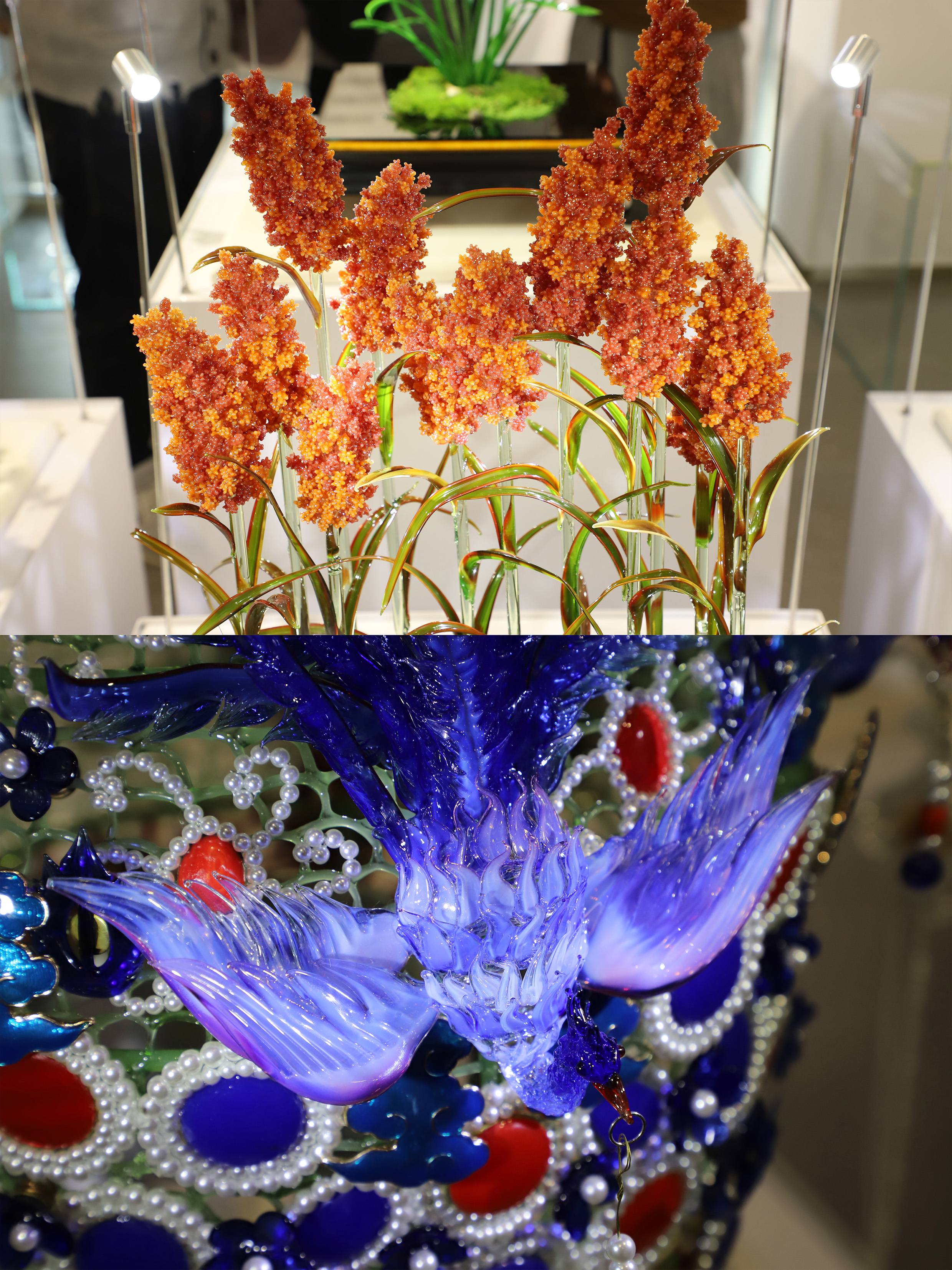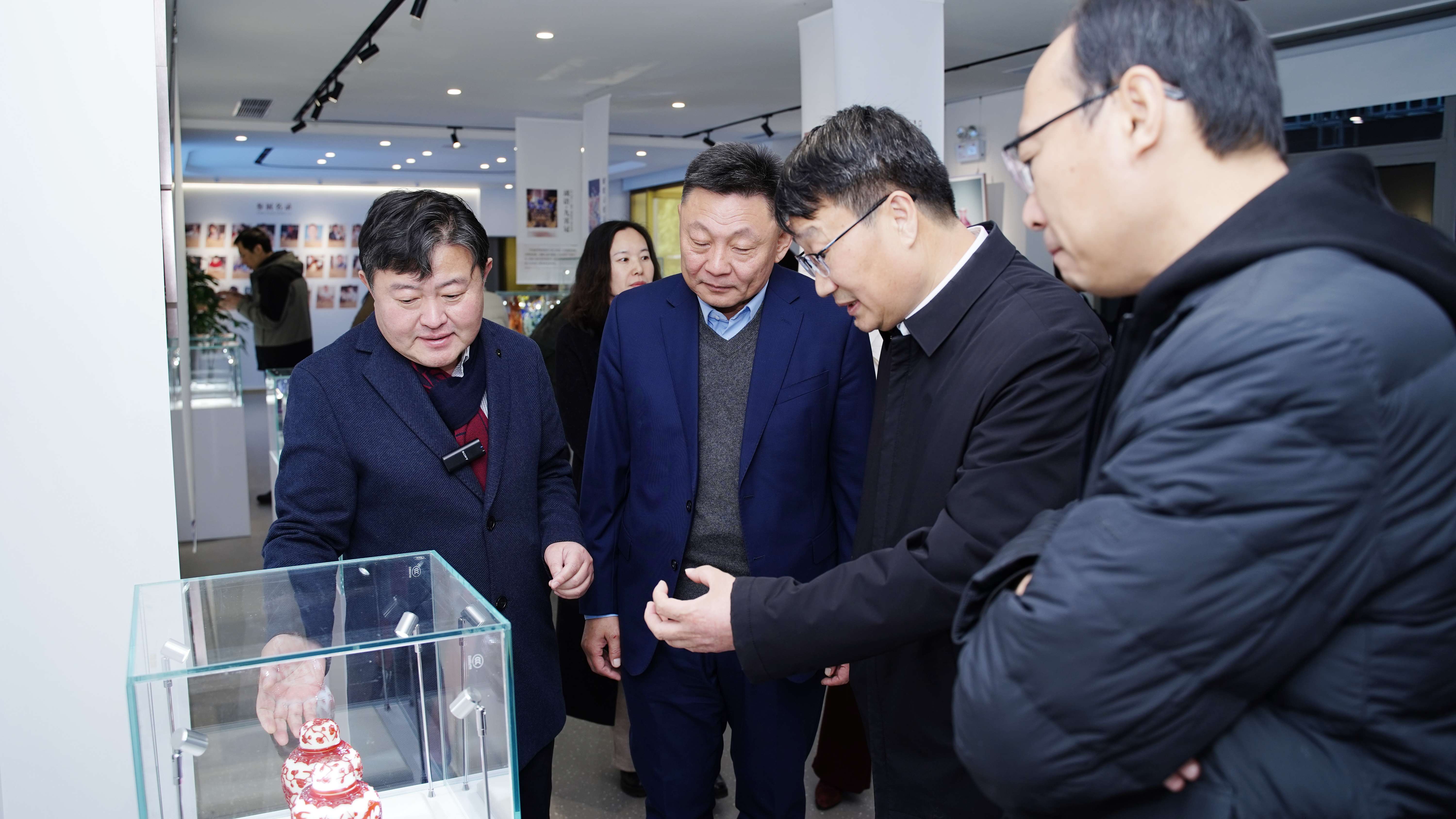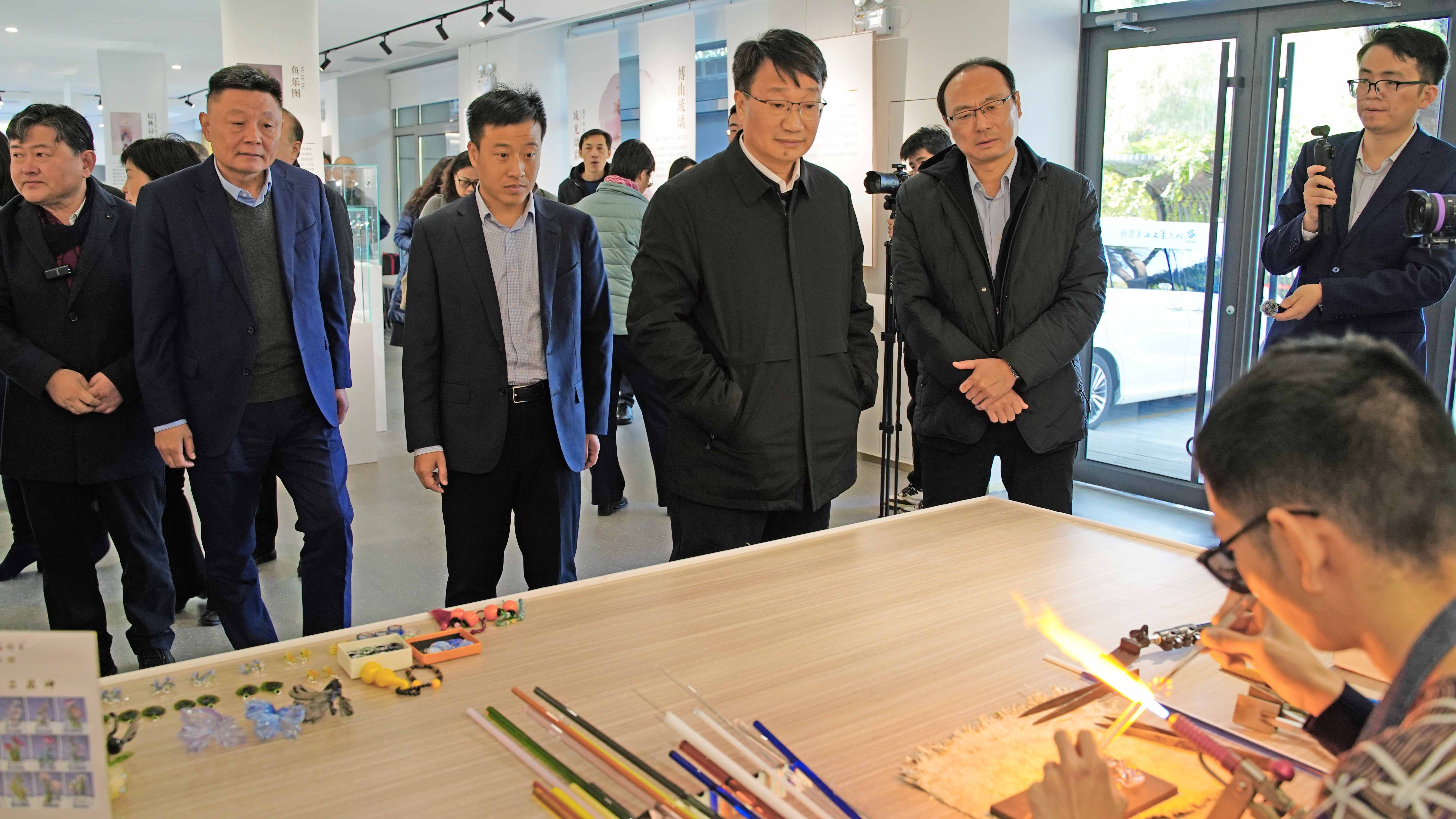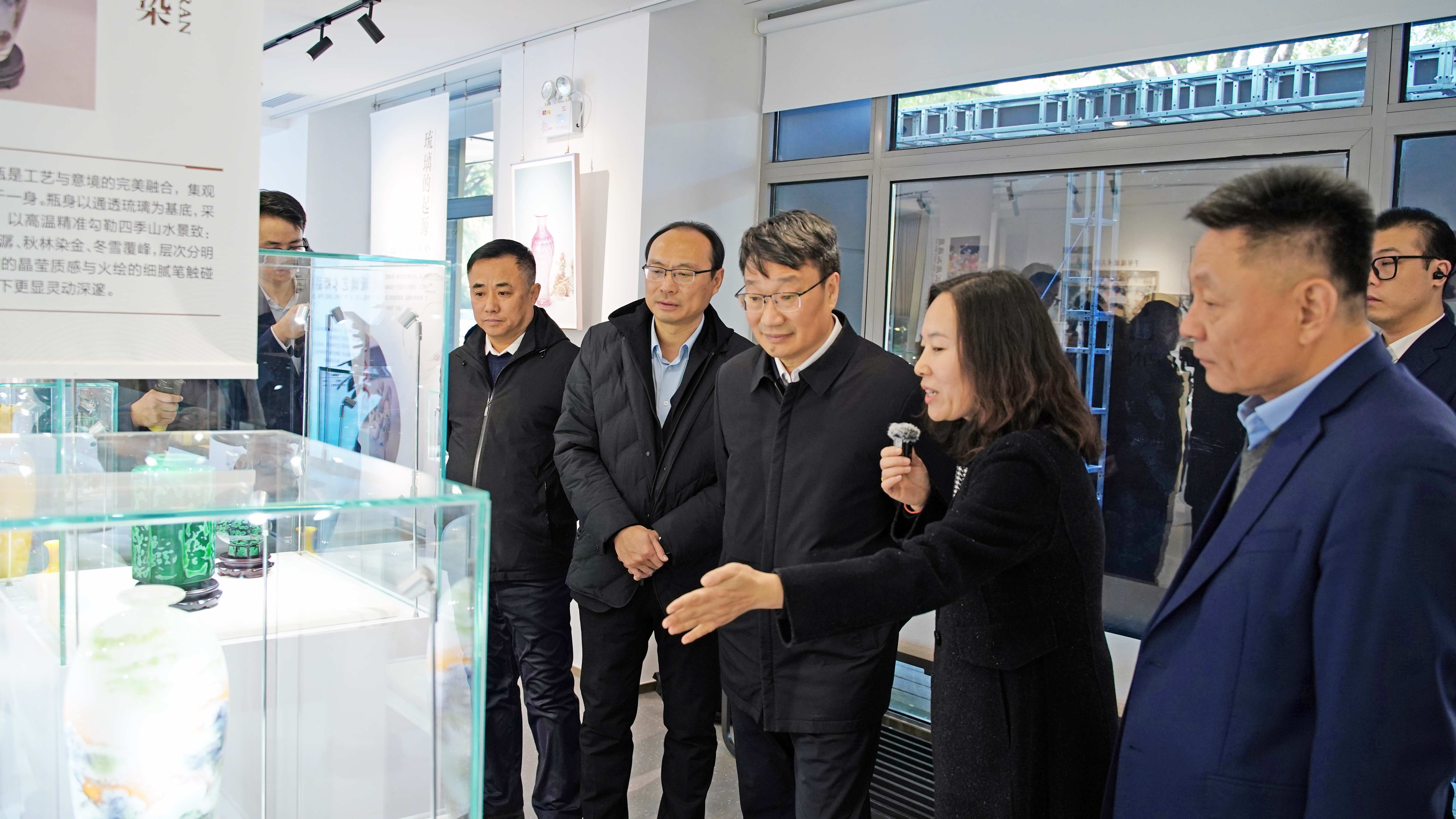 开幕仪式结束后,到场领导及嘉宾前往山东琉璃艺术精品展观览。展览紧扣“走在前、开新局”目标定位,以“传承红色基因,绽放齐鲁匠心”为主线,系统梳理并集中呈现山东琉璃艺术的历史脉络与当代创新实践。展品涵盖战国时期琉璃文物及四十余件现当代精品,展现了琉璃镌刻、鸡油黄、鸡肝石、琉璃内画、灯工等代表性技艺。部分展品此前曾在中国国家博物馆展出,体现了传统工艺从保护传承到创新发展的良性生态。