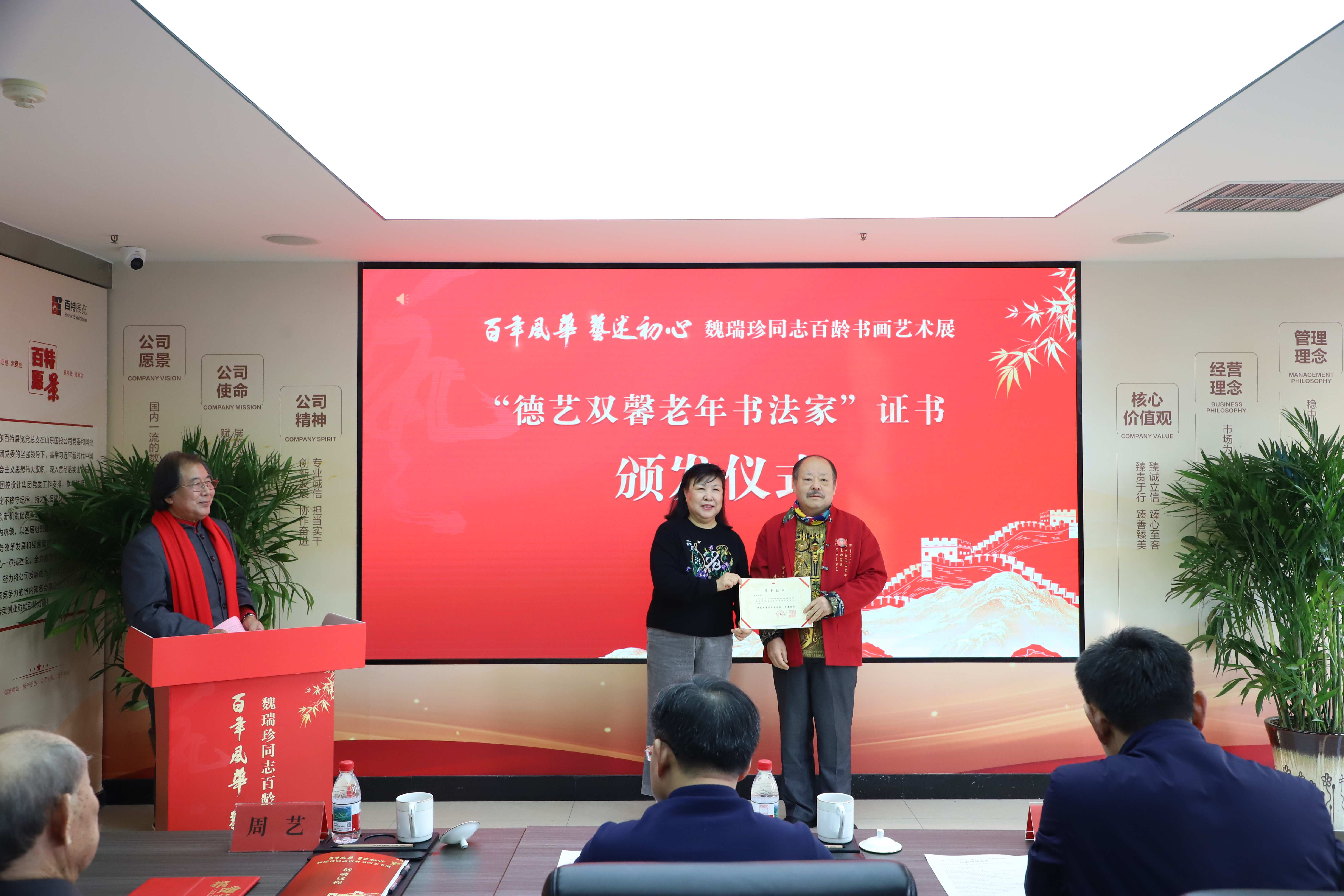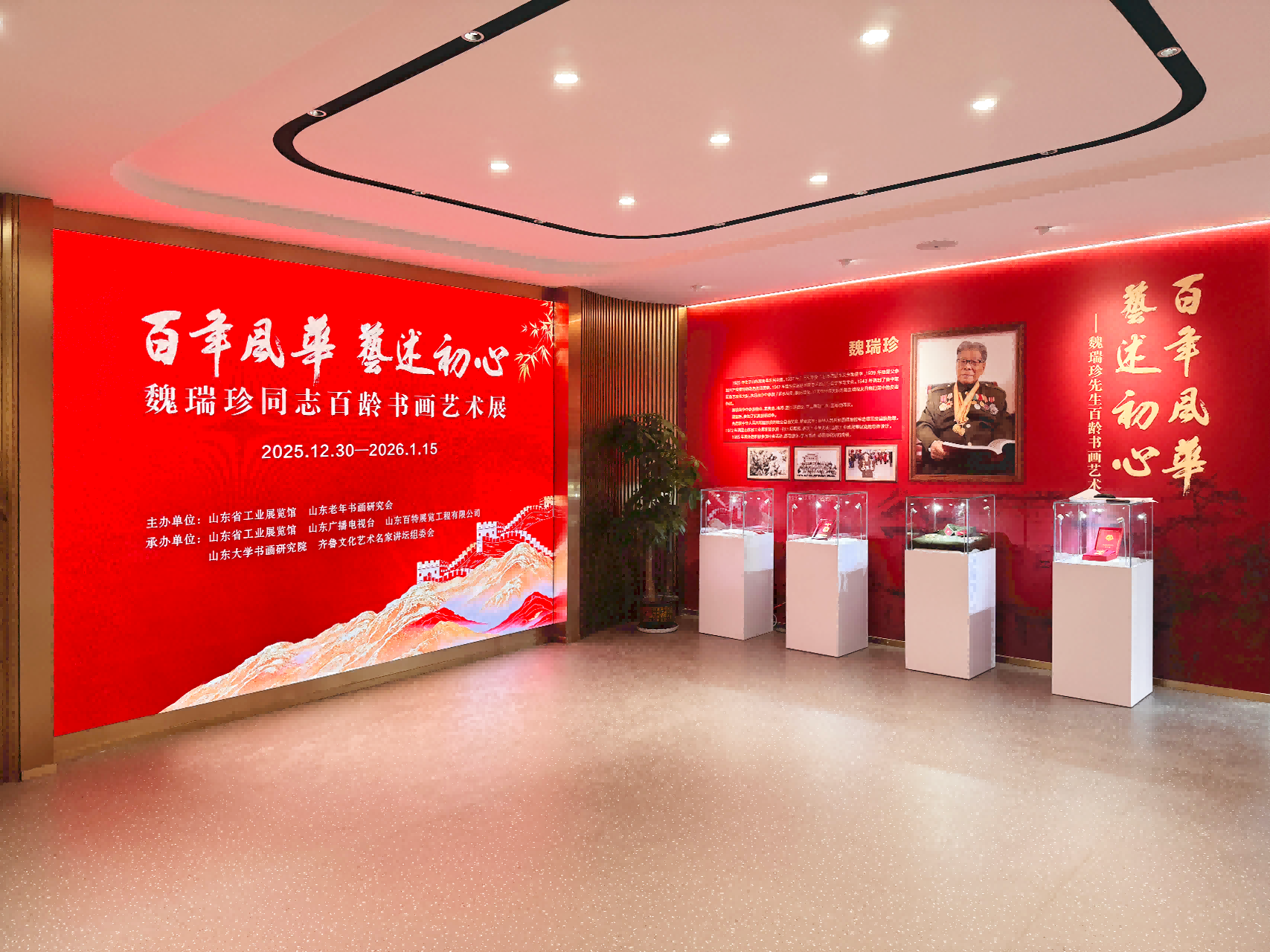2025年12月30日,由山东省工业展览馆与山东老年书画研究会联合主办,山东广播电视台、山东百特展览工程有限公司、山东大学书画研究院、齐鲁文化艺术名家讲坛组委会共同承办的“百年风华·艺述初心——魏瑞珍同志百龄书画艺术展”在泉城济南隆重开幕。